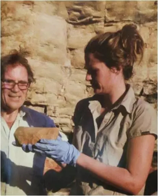 ▲發(fā)掘者在檢查一塊底層出土的磨石