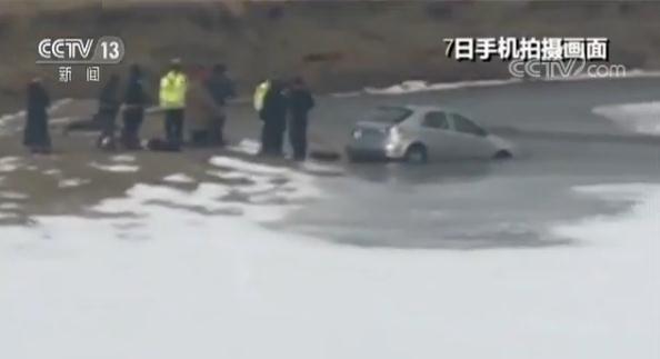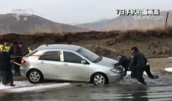 當時河水的水溫只有零下十度,民警和群眾不顧刺骨的冰冷,跳入河中,系繩推車,最終把車子拉回了岸邊。