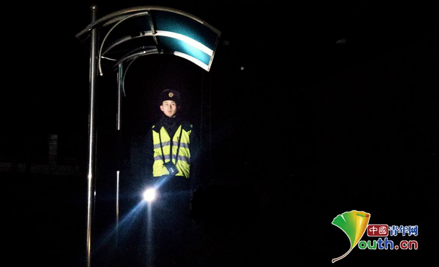 深夜,巴山站助理值班員武圣焜手持信號燈在立崗亭接車。中國青年網通訊員 田亞輝攝