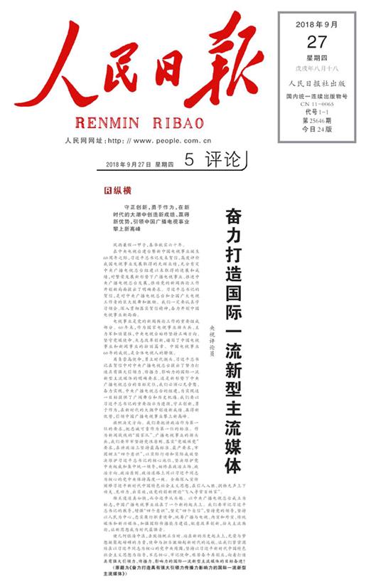 央視網消息:9月27日出版的人民日報在顯著位置刊發央視評論員文章《奮力打造國際一流新型主流媒體》。全文如下: