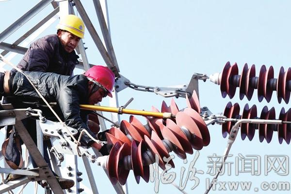 臨汾新聞網訊 近日,古縣供電公司工作人員在35KV安舊線40號桿塔上進行檢查維修,確保雪冰凍災害天氣下電網安全穩定運行。入冬以來,該公司加強輸變電設備運行監測和電力設施特巡,及時發現和解決異常情況,保障電力可靠供應。(張天杰)