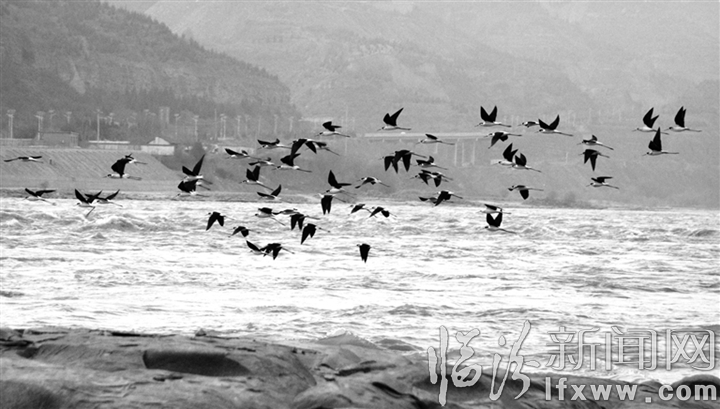 臨汾新聞網(wǎng)訊 近日,一群反嘴鷸在吉縣壺口瀑布上游河面上展翅飛翔。