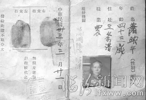 翻開(kāi)證件內(nèi)頁(yè),右側(cè)用豎寫(xiě)的繁體字記錄了所有人的詳細(xì)信息,從右到左依次為“姓名:蕭映午;性別:男;年齡:四十三歲;住址:三條溝;職業(yè):農(nóng);填發(fā)機(jī)關(guān):洪洞縣警察所。”除此之外,在證件內(nèi)頁(yè)的左側(cè)上方還印有左右手的食指指紋,指紋右側(cè)寫(xiě)著發(fā)證時(shí)間為“中華民國(guó)卅三年三月廿一日”,側(cè)邊寫(xiě)著“發(fā)給此證不取分文”,下方標(biāo)注著“無(wú)照片者得以指紋代之”。蕭映午的照片沒(méi)有了粘性,只得夾放在內(nèi)頁(yè)中間。在蕭映午的一寸黑白照片上,能清楚看到編號(hào)為39901。