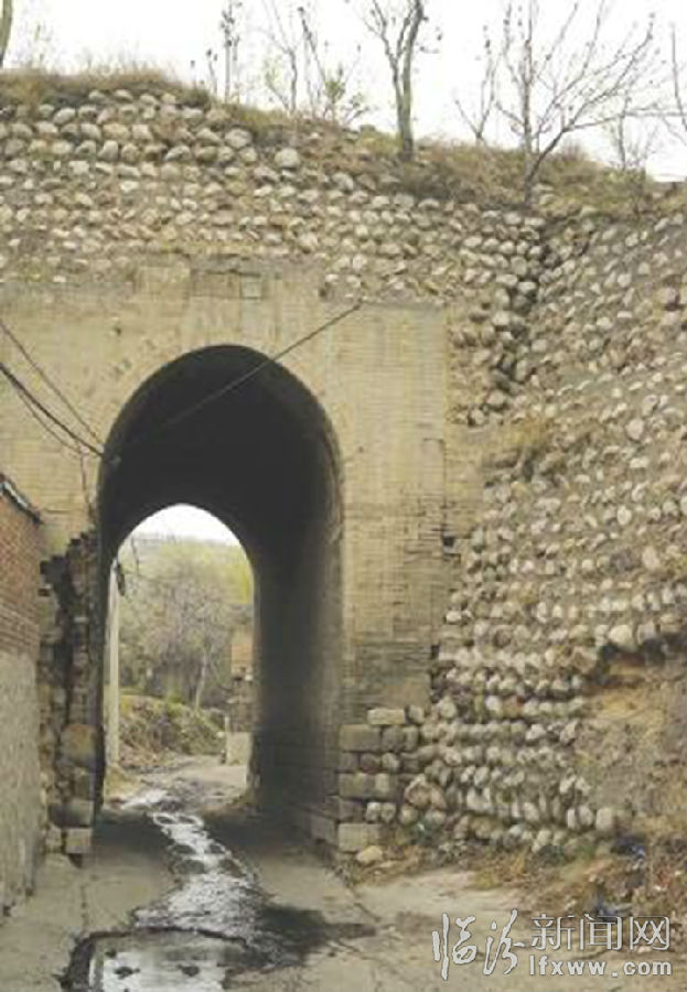 在其村子的南邊有一個古老的村門,古村門的基礎(chǔ)是 條石,主體用磚砌筑,門洞有兩層樓高,門洞上方是古代人用石頭壘砌的古水渠,門洞東邊鑲嵌著石雕“干河鎮(zhèn)”三個字。在門洞周圍尋找建設(shè)信息無果,問村民也說不出所以然,因此該門洞建設(shè)于哪個時期依然是個謎。
