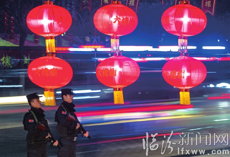 臨汾新聞網訊 春節期間,洪洞縣公安局啟動多警種聯合巡邏機制,開展“大巡邏保平安”活動。800余名警察巡邏在大街小巷,前移工作服務崗位,提高市民見警率和安全感。圖為特警在大槐樹景區附近巡邏。