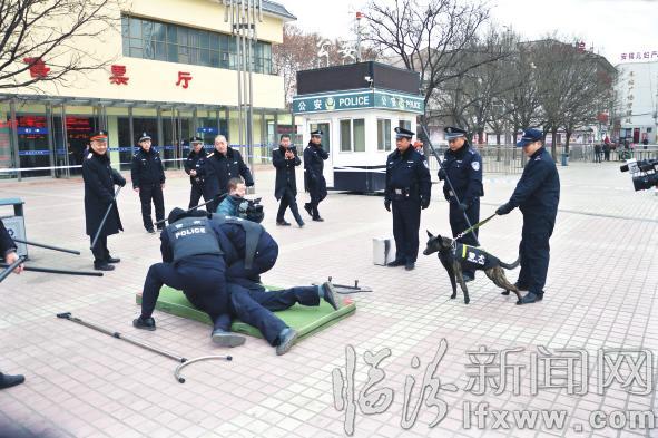 臨汾新聞網訊 春節臨近,為全力搞好2016年春運安保工作,進一步提升反恐防暴能力和水平,侯馬車站派出所提前著手,全面加強春運備戰。圖為派出所在侯馬車站組織反恐防暴實戰化演練。(劉紅星)