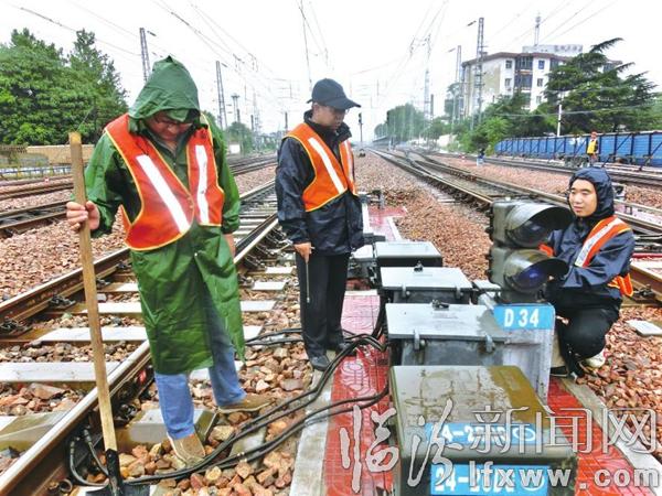 臨汾新聞網訊 7月14日,太原鐵路局侯馬電務段的干部和職工在冒雨巡檢電務信號設備。侯馬電務段針對近期降雨偏多的情況,加大對信號機、電纜等設備設施的檢查整治力度,確保汛期設備安全運行。白鵬 攝