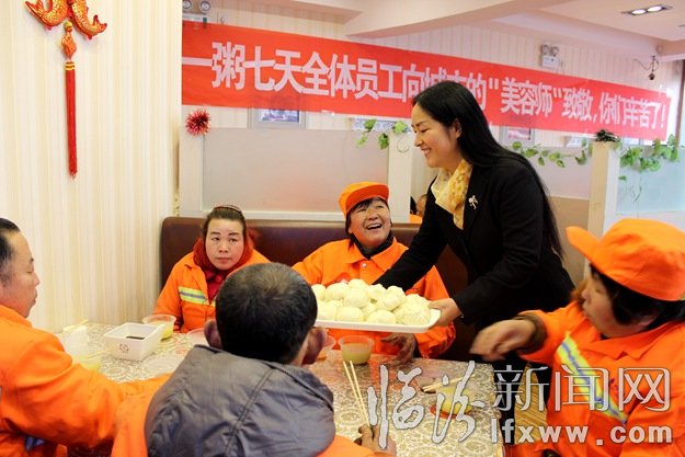 當天中午,霍州市婦聯、“一粥七天”快餐店員工加班加點包出5000個包子和熱粥,送到了工作在一線的環衛工人手中,并到部分環衛工人家中走訪慰問,向廣大環衛工人表示衷心的感謝和節日的問候。