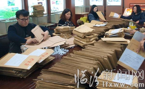臨汾新聞網訊 按照市委開展“冬季行動”的安排部署,1月26日,霍州市檔案局全面啟動了進館檔案整理工作。該局要求全體檔案工作者,層層分解責任,層層傳導壓力,激勵廣大檔案工作者變“冬閑”為“冬忙”,馬上就辦,真抓實干,敢作為、善作為、有作為,為“十二五”掃好尾、收好官,為“十三五”開好局、起好步,為新一年檔案工作打好基礎、贏得主動。全局人員分為三個組,一條龍流水作業,每個組一周時間完成1088卷的整理編號及上架任務,三個組共完成3264卷工商局移交進館工作任務。圖為檔案工作者在整理檔案。喬晶明 攝