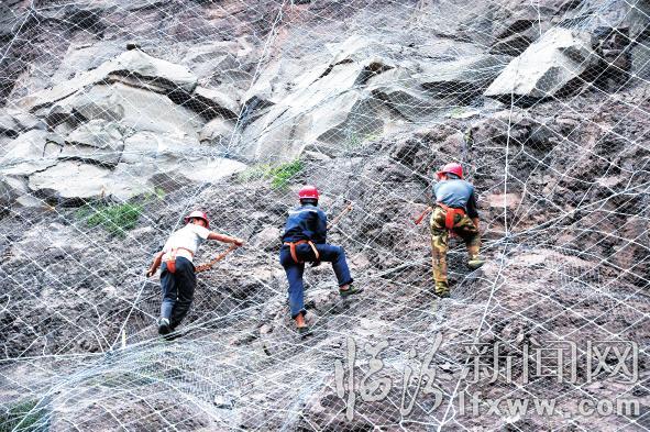 臨汾新聞網訊 近日,吉縣壺口瀑布風景區組織專業人員,對該景區至克難坡景區的道路兩側山坡進行了安全隱患排查,確保汛期游人和車輛的安全通行。圖為工作人員在鋪設鋼絲網以預防山體滑坡和落石。