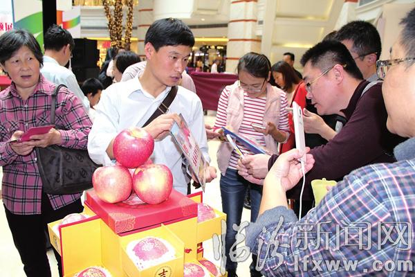 臨汾新聞網訊 日前,在上海環球港購物中心,臨汾市吉縣果業服務中心的工作人員在向上海市民推銷吉縣蘋果。吉縣果業服務中心在我市舉辦的“帝堯之都,中國之源”上海城市推介活動中,開展了微信營銷推介、現場品嘗等活動,讓市民更好地了解吉縣蘋果,讓臨汾的特色農產品走進國際化的大都市市場。 記者 閆銳鵬 攝