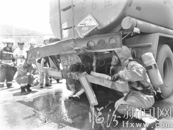 臨汾新聞網訊 6月8日11點20分,在吉縣屯里鎮回宮村路段,兩輛車發生追尾事故,一輛載有32噸液堿的罐車發生泄漏。事發后,吉縣消防、交警、安檢、環保等部門前往協同處置。據了解,一輛半掛車車頭與掛載有32余噸液堿的罐車尾部相撞,導致罐車管道破裂,發生液堿泄漏。消防官兵在事故地段設置警戒線,疏散圍觀群眾,以免造成傷害,經過一個多小時的緊張處置,罐車的泄漏部位被成功封堵。隨后,消防官兵又對路面殘留的液堿進行填埋。此次事故未造成人員傷亡。圖為消防官兵對泄漏部位進行封堵。