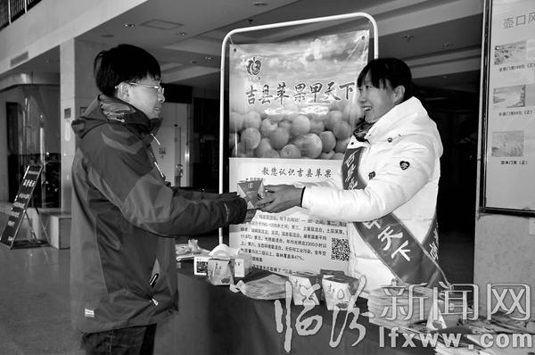 臨汾新聞網訊 12月25日,吉縣壺口景區工作人員給游客免費送吉縣蘋果。當日,為了進一步推動壺口景區發展和吉縣蘋果的知名度,壺口瀑布風景區推出“玉壺觀瀑·金果祝福”活動,讓廣大游客在享受門票半價的同時,免費品嘗吉縣蘋果,更有效地發揮旅游帶動地方經濟發展和脫貧致富的作用。 (呂桂明)