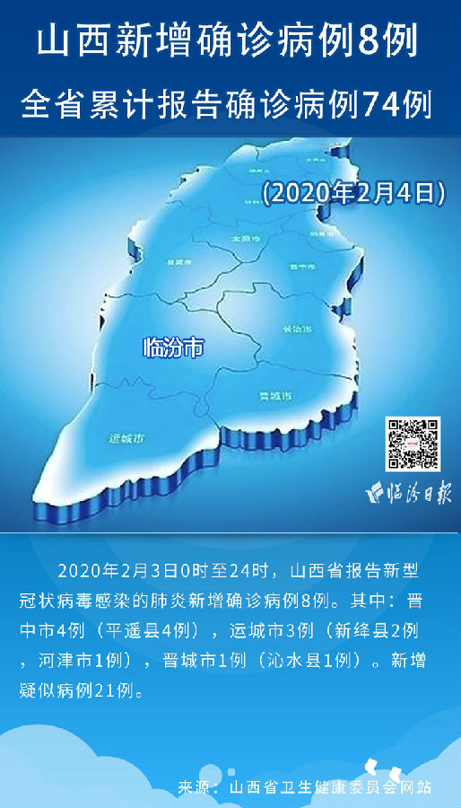 2020年2月3日0時至24時,山西省報告新型冠狀病毒感染的肺炎新增確診病例8例。其中:晉中市4例(平遙縣4例),運城市3例(新絳縣2例,河津市1例),晉城市1例(沁水縣1例)。新增疑似病例21例。