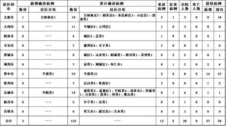 2020年2月10日0時至24時,山西省報告新增新型冠狀病毒肺炎確診病例3例,累計確診病例122例。新增治愈出院1例,累計治愈出院26例。現(xiàn)有在院隔離治療96例,其中重癥12例,危重癥5例。目前累計追蹤到密切接觸者3332人,當(dāng)日解除醫(yī)學(xué)觀察152人,共有985人正在接受醫(yī)學(xué)觀察。