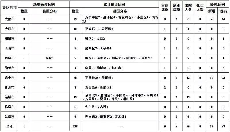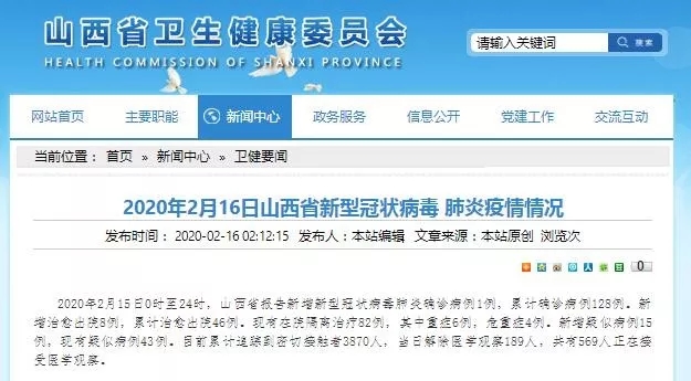 2020年2月15日0時至24時,山西省報告新增新型冠狀病毒肺炎確診病例1例,累計確診病例128例。新增治愈出院8例,累計治愈出院46例。現有在院隔離治療82例,其中重癥6例,危重癥4例。新增疑似病例15例,現有疑似病例43例。目前累計追蹤到密切接觸者3870人,當日解除醫學觀察189人,共有569人正在接受醫學觀察。