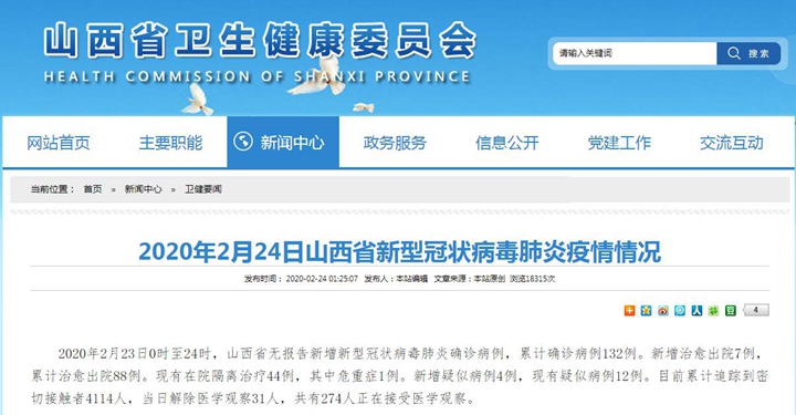 2020年2月23日0時至24時,山西省無報告新增新型冠狀病毒肺炎確診病例,累計確診病例132例。新增治愈出院7例,累計治愈出院88例。現有在院隔離治療44例,其中危重癥1例。新增疑似病例4例,現有疑似病例12例。目前累計追蹤到密切接觸者4114人,當日解除醫學觀察31人,共有274人正在接受醫學觀察。