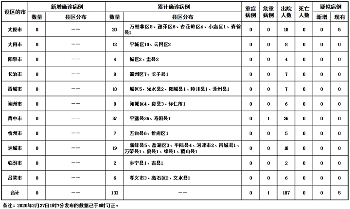 20年2月27日0時至24時,山西省無新增新型冠狀病毒肺炎確診病例,累計報告確診病例133例。新增治愈出院3例,累計治愈出院107例。現有在院隔離治療確診病例26例,其中危重癥1例。無新增疑似病例,現有疑似病例5例。累計追蹤到密切接觸者4144人,當日解除醫學觀察17人,尚在醫學觀察的密切接觸者142人。