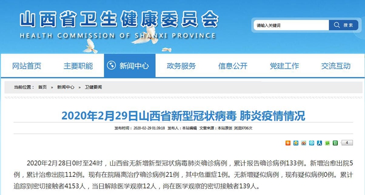 2020年2月28日0時至24時,山西省無新增新型冠狀病毒肺炎確診病例,累計報告確診病例133例。新增治愈出院5例,累計治愈出院112例。現有在院隔離治療確診病例21例,其中危重癥1例。無新增疑似病例,現有疑似病例0例。累計追蹤到密切接觸者4153人,當日解除醫學觀察12人,尚在醫學觀察的密切接觸者139人。