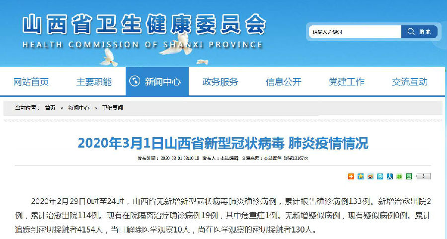 2020年2月29日0時至24時,山西省無新增新型冠狀病毒肺炎確診病例,累計報告確診病例133例。新增治愈出院2例,累計治愈出院114例?,F有在院隔離治療確診病例19例,其中危重癥1例。無新增疑似病例,現有疑似病例0例。累計追蹤到密切接觸者4154人,當日解除醫學觀察10人,尚在醫學觀察的密切接觸者130人。