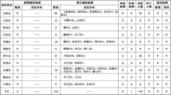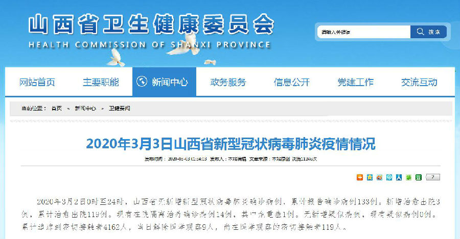 2020年3月2日0時至24時,山西省無新增新型冠狀病毒肺炎確診病例,累計報告確診病例133例。新增治愈出院3例,累計治愈出院119例?,F有在院隔離治療確診病例14例,其中危重癥1例。無新增疑似病例,現有疑似病例0例。累計追蹤到密切接觸者4162人,當日解除醫學觀察9人,尚在醫學觀察的密切接觸者119人。