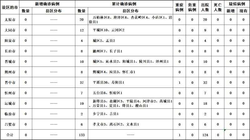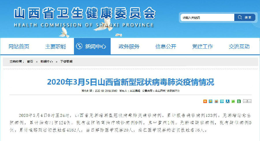 2020年3月4日0時至24時,山西省無新增新型冠狀病毒肺炎確診病例,累計報告確診病例133例。無新增治愈出院病例,累計治愈出院124例。現有在院隔離治療確診病例9例,其中重癥1例。無新增疑似病例,現有疑似病例0例。累計追蹤到密切接觸者4162人,當日解除醫學觀察20人,尚在醫學觀察的密切接觸者76人。