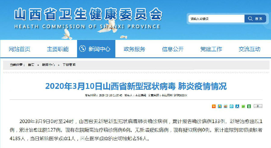 2020年3月9日0時至24時,山西省無新增新型冠狀病毒肺炎確診病例,累計報告確診病例133例。新增治愈出院1例,累計治愈出院127例。現(xiàn)有在院隔離治療確診病例6例。無新增疑似病例,現(xiàn)有疑似病例0例。累計追蹤到密切接觸者4185人,當日解除醫(yī)學觀察1人,尚在醫(yī)學觀察的密切接觸者56人。