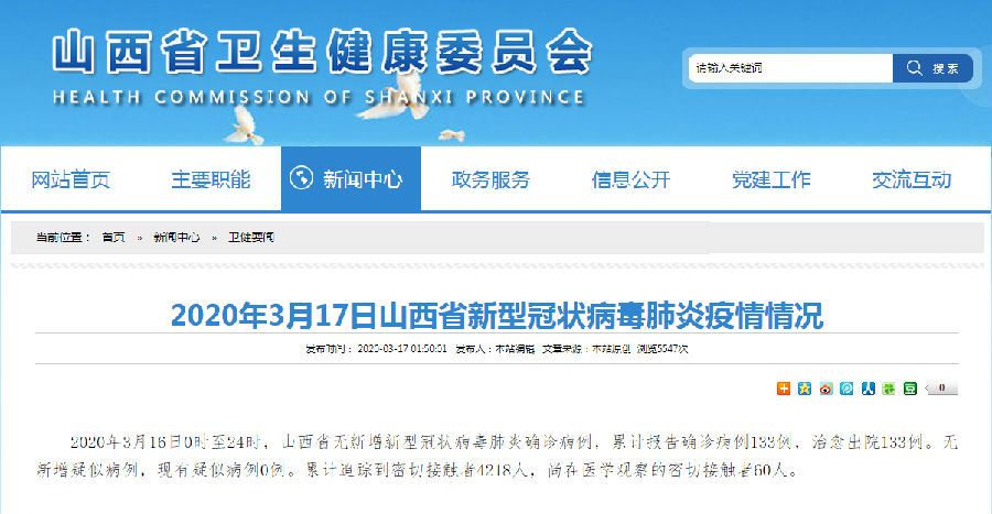 2020年3月16日0時至24時,山西省無新增新型冠狀病毒肺炎確診病例,累計報告確診病例133例,治愈出院133例。無新增疑似病例,現有疑似病例0例。累計追蹤到密切接觸者4218人,尚在醫學觀察的密切接觸者60人。