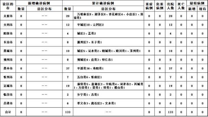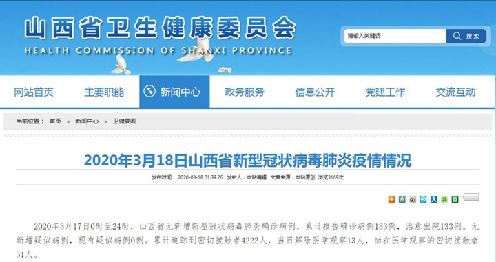 2020年3月17日0時至24時,山西省無新增新型冠狀病毒肺炎確診病例,累計報告確診病例133例,治愈出院133例。無新增疑似病例,現有疑似病例0例。累計追蹤到密切接觸者4222人,當日解除醫學觀察13人,尚在醫學觀察的密切接觸者51人。