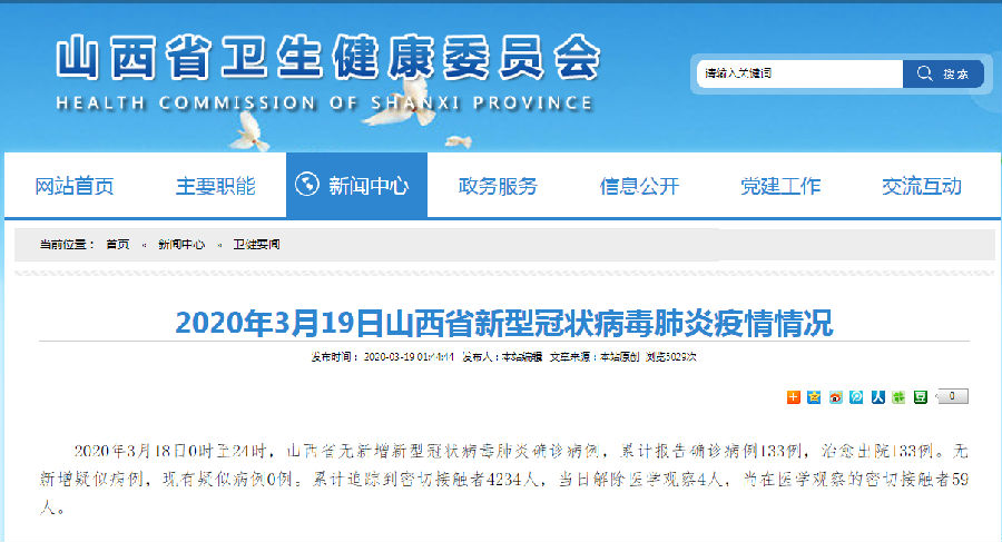 2020年3月18日0時至24時,山西省無新增新型冠狀病毒肺炎確診病例,累計報告確診病例133例,治愈出院133例。無新增疑似病例,現有疑似病例0例。累計追蹤到密切接觸者4234人,當日解除醫學觀察4人,尚在醫學觀察的密切接觸者59人。