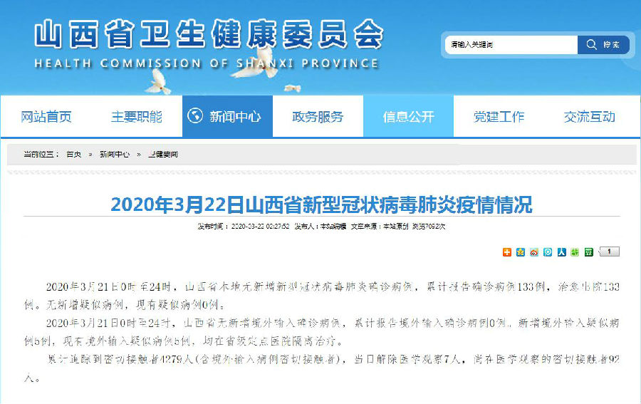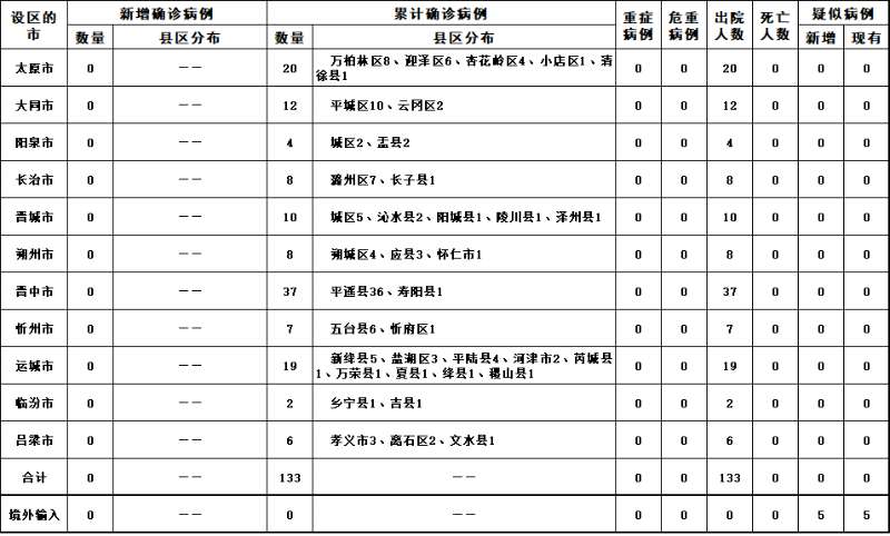 2020年3月21日0時至24時,山西省本地無新增新型冠狀病毒肺炎確診病例,累計報告確診病例133例,治愈出院133例。無新增疑似病例,現(xiàn)有疑似病例0例。
