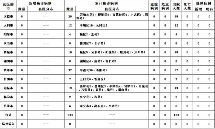 2020年3月22日0時至24時,山西省本地?zé)o新增新型冠狀病毒肺炎確診病例,累計報告確診病例133例,治愈出院133例。無新增疑似病例,現(xiàn)有疑似病例0例。
