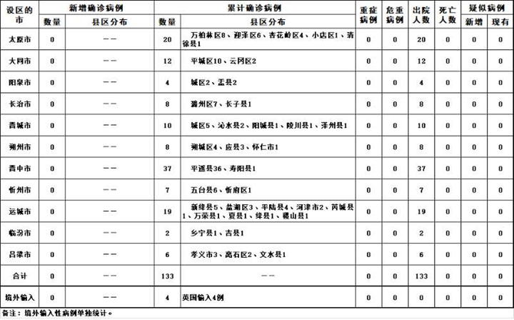2020年4月3日0-24時(shí),山西省本地?zé)o新增新型冠狀病毒肺炎確診病例,累計(jì)報(bào)告確診病例133例,治愈出院133例。無新增疑似病例,現(xiàn)有疑似病例0例。