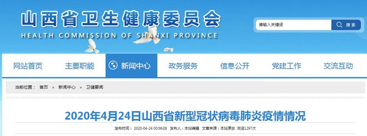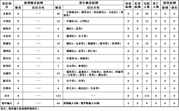 2020年4月23日0-24時,山西省本地無新增新冠肺炎確診病例、疑似病例和無癥狀感染者。累計報告確診病例133例,治愈出院133例。