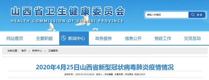 2020年4月24日0-24時,山西省本地?zé)o新增新冠肺炎確診病例、疑似病例和無癥狀感染者。累計報告確診病例133例,治愈出院133例。
