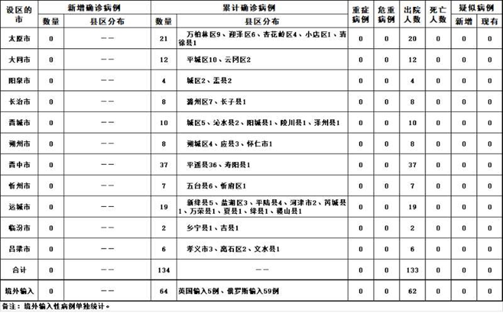 2020年5月7日0-24時,山西省無本地新增新冠肺炎確診病例。累計報告確診病例134例,治愈出院133例,現有在院隔離治療病例1例。現有疑似病例0例。