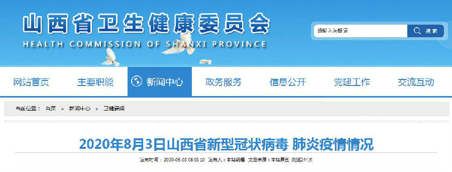 2020年8月2日0-24時,山西省本地無新增新冠肺炎確診病例。累計報告確診病例134例,治愈出院134例。現有疑似病例0例。
