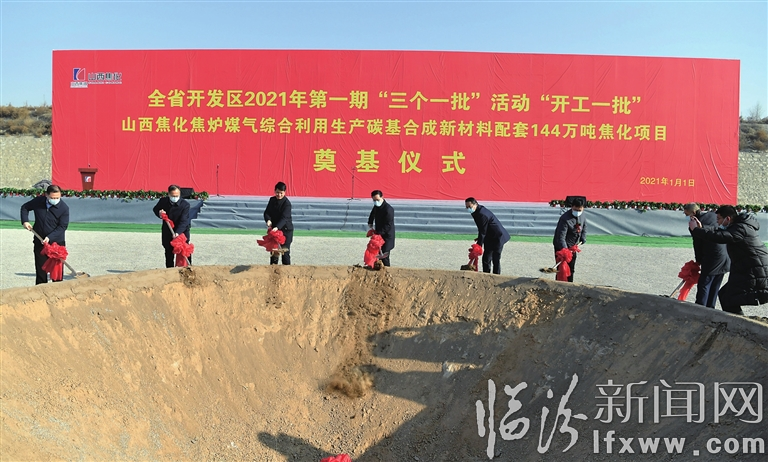 1月1日上午,全省開發區2021年第一期項目集中簽約開工投產“三個一批”活動舉行。我市分會場設在洪洞經濟技術開發區,與全省同步舉行項目集中簽約儀式,并舉行項目開工奠基儀式和現場觀摩。圖為董一兵李云峰等為項目開工培土奠基。 記者 蘇亞兵 攝