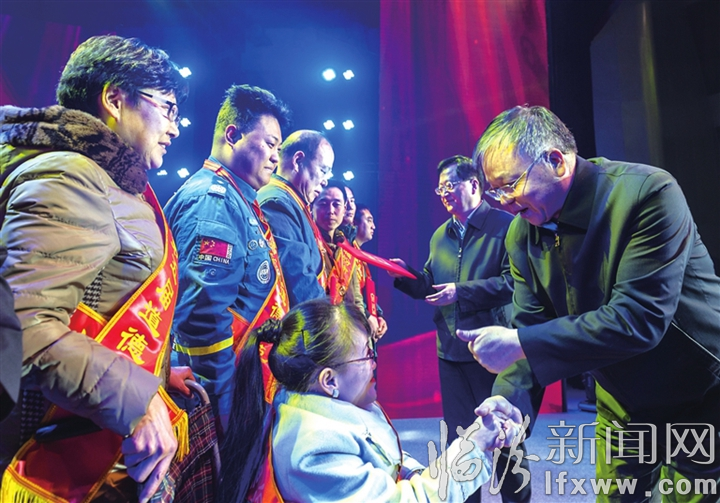 講述動人故事,傳遞道德力量。12月19日晚,市影劇院內座無虛席,“德耀平陽”臨汾市第五屆“十大道德楷?!鳖C獎典禮在這里隆重舉行。省人大常委會副主任、市委書記岳普煜,市委副書記、市長劉予強分別為“十大道德楷?!鲍@得者頒發獎牌和證書。市領導陳小洪、張建平、周計偉、李朝旗、郭行杰、劉文華、張庚博、王國平、馮建寧、潘海燕、閆建國、張翔、楊忠華、梁清燕,山西師范大學臨汾學院黨委書記毛跟云出席頒獎典禮。圖為岳普煜、劉予強為“十大道德楷?!鲍@得者頒獎。記者 閆銳鵬 攝
