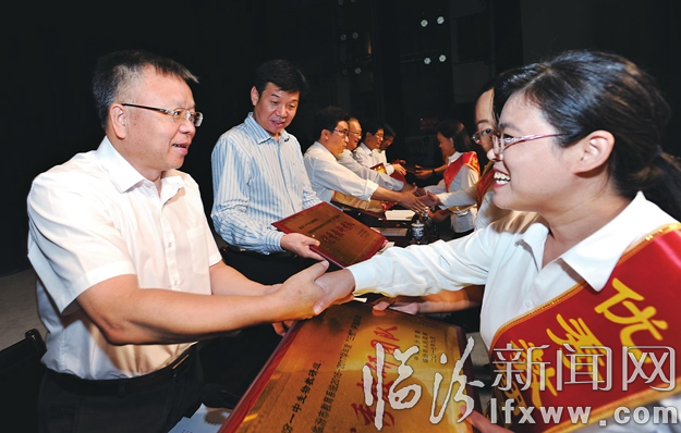 圖為岳普煜等市領導向受表彰的優秀教師和集體頒獎。記者 趙俊堂 攝