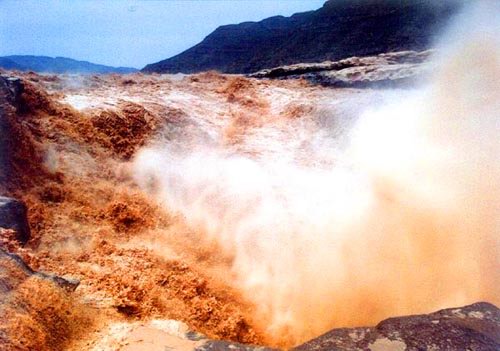 壺口瀑布,落差約30米,寬度最大時可達(dá)千余米,最大瀑面3萬平方米。滾滾洪流,到這里急速收斂,注入深潭,聲似雷鳴,數(shù)公里外可聞;水波急濺,激起百丈水柱,形成騰騰霧氣,真有驚濤拍岸,濁浪排空,倒卷半天煙云之勢!每每夏秋之季,彩虹貫于晴空,分外秀麗。其聲、其勢、其景,壯、秀、奇,使人不能不為之陶醉。