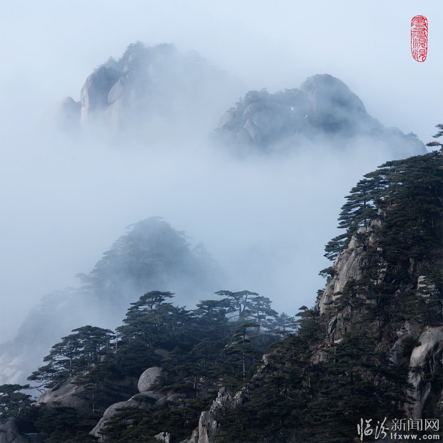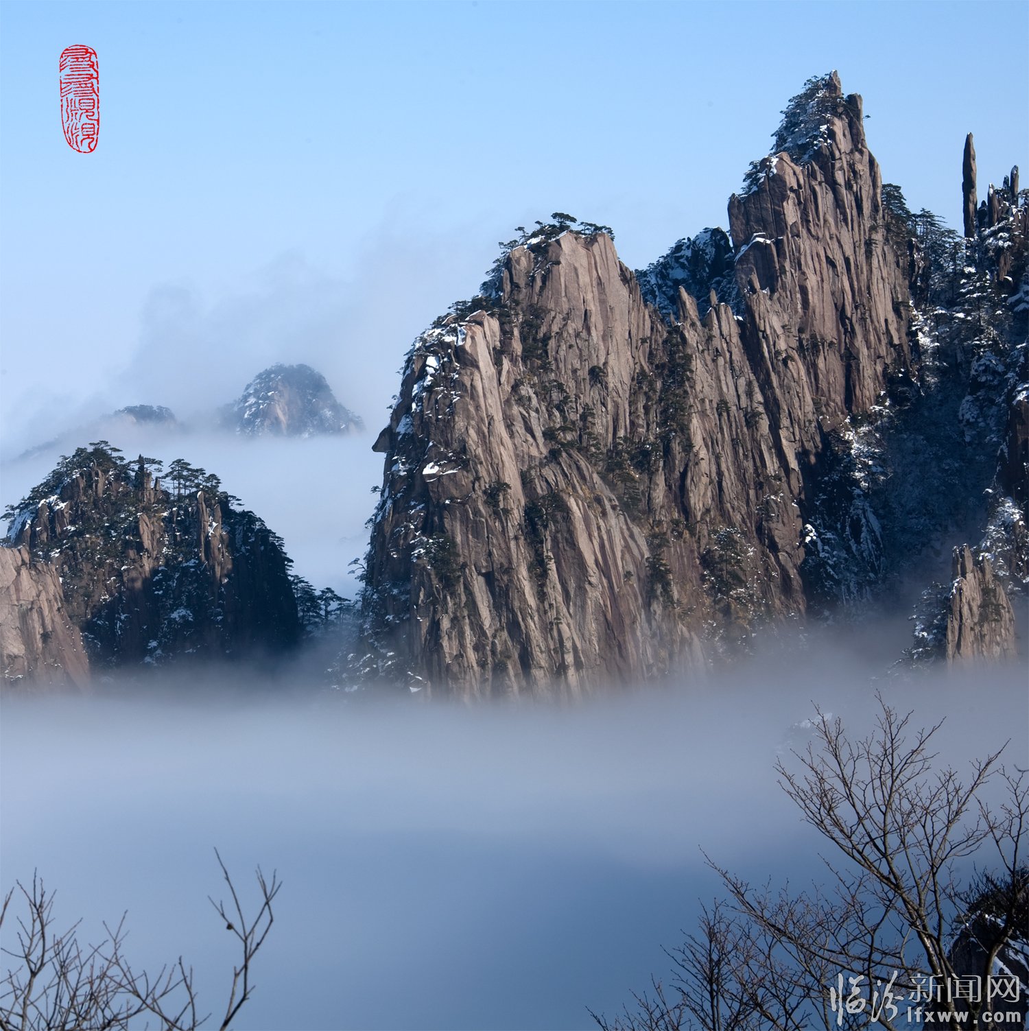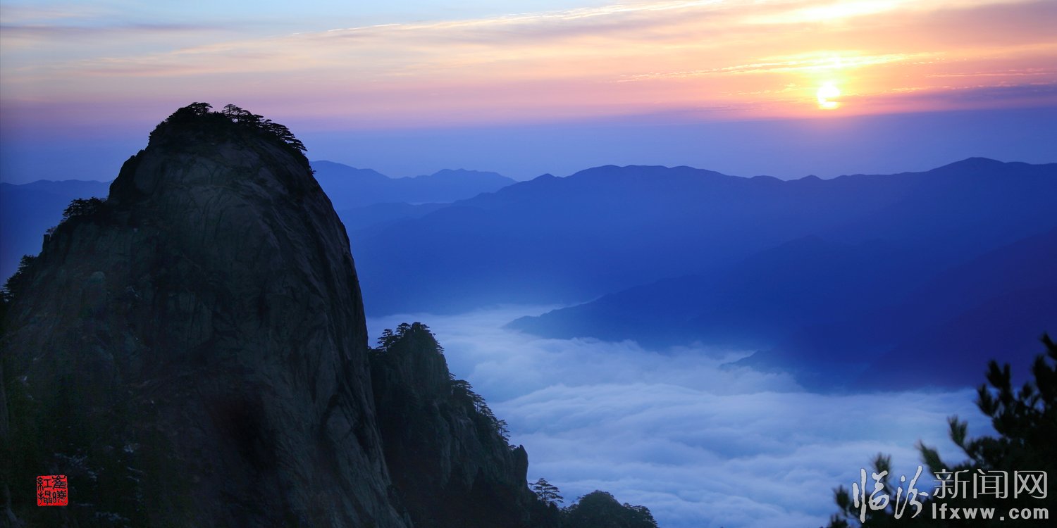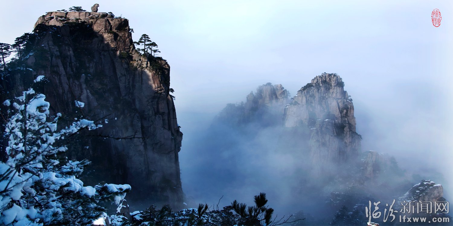 黃山頌(崔曉紅) 奇松怪石云海飛,日出月升彩霞紅。 天賜瑞雪扮山神,我借美景頌天公。