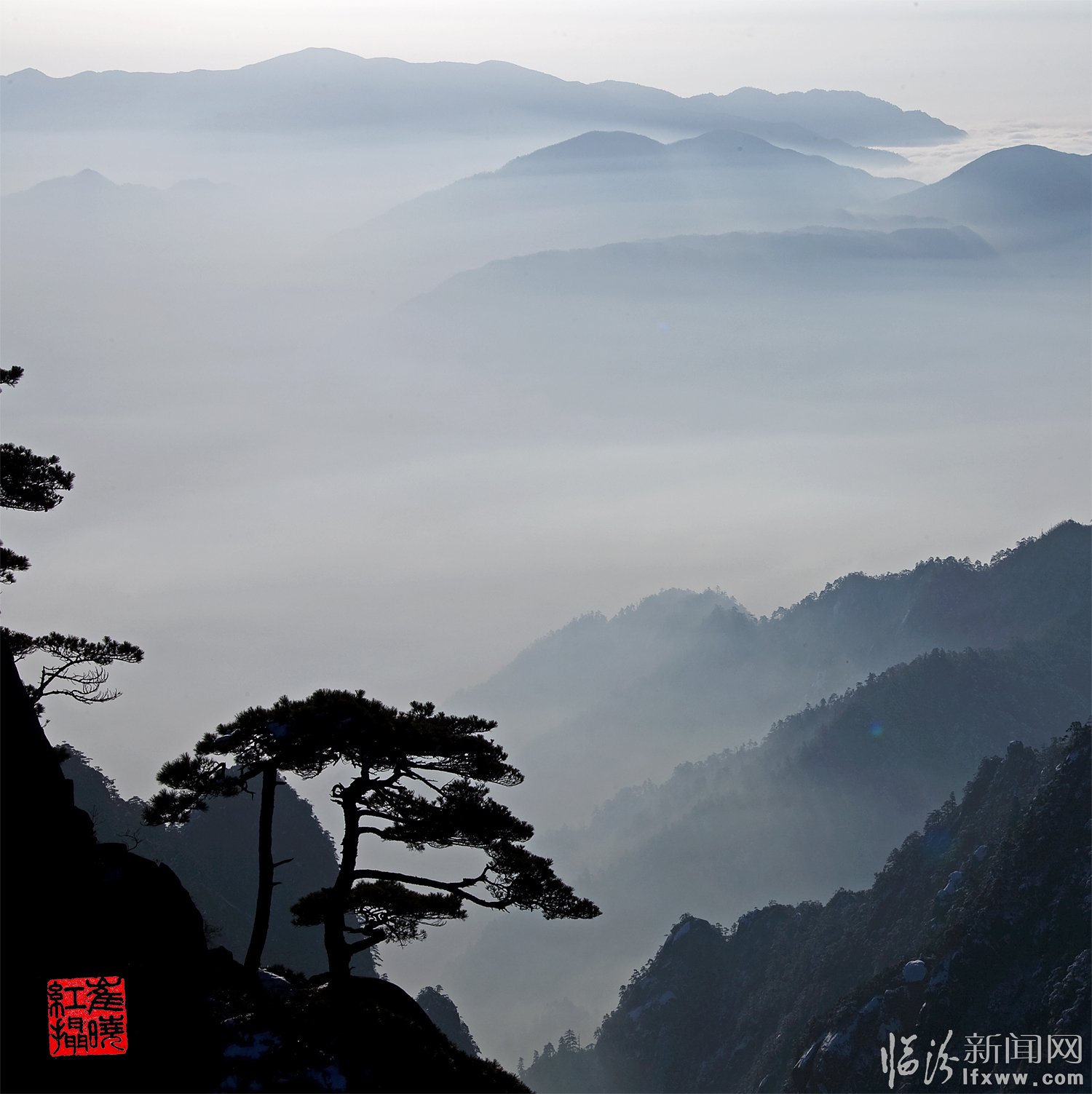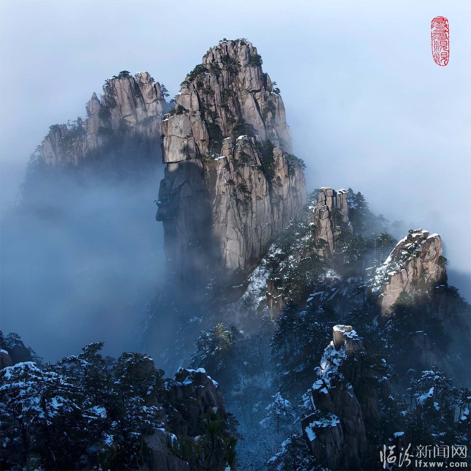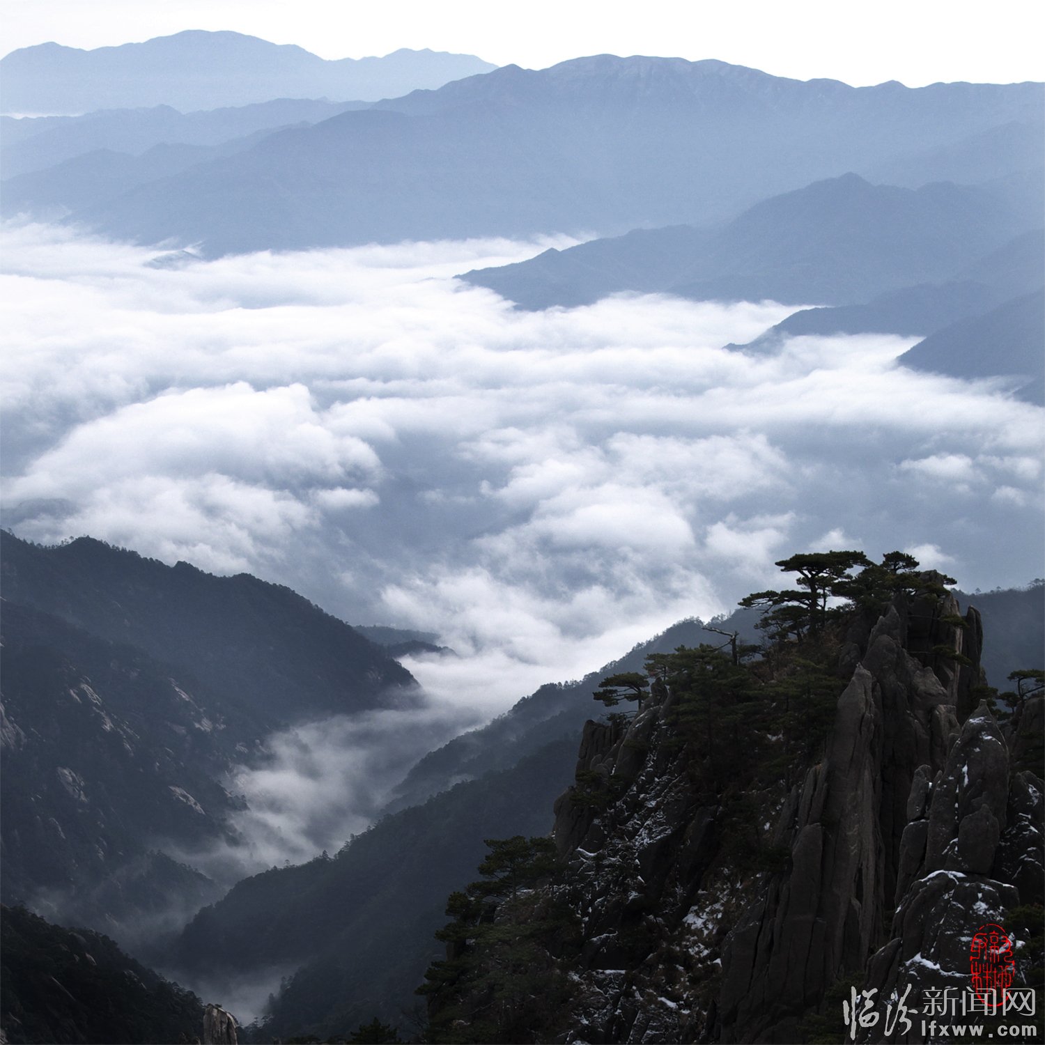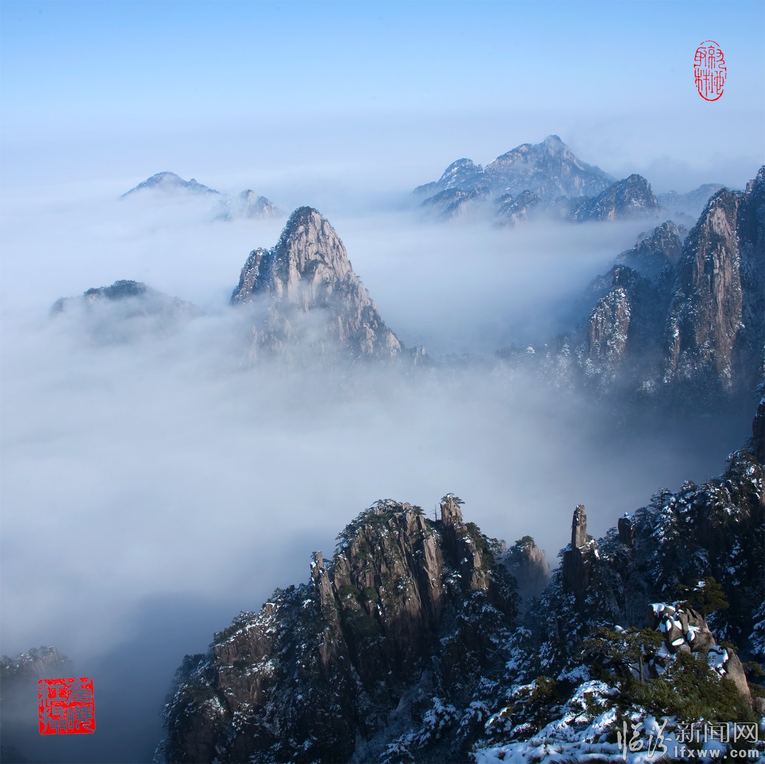 黃山頌(崔曉紅) 奇松怪石云海飛,日出月升彩霞紅。 天賜瑞雪扮山神,我借美景頌天公。