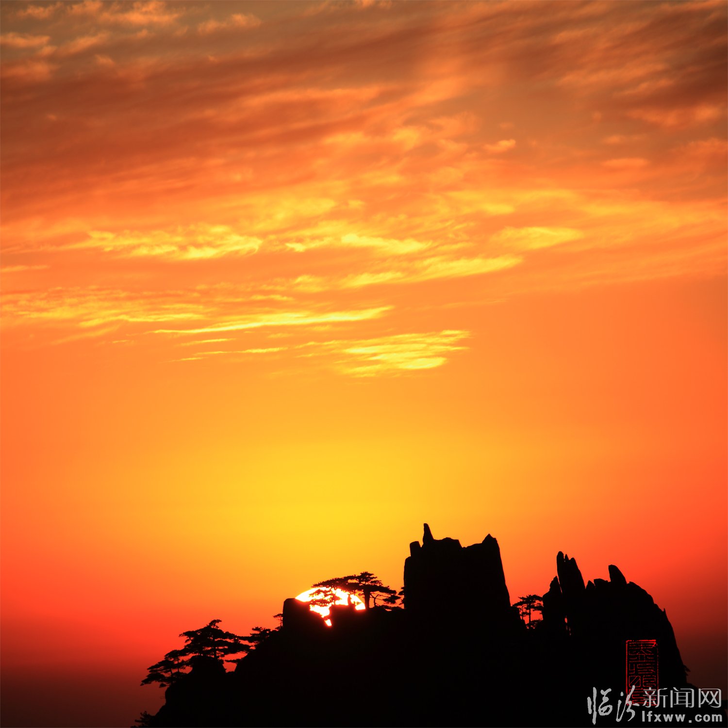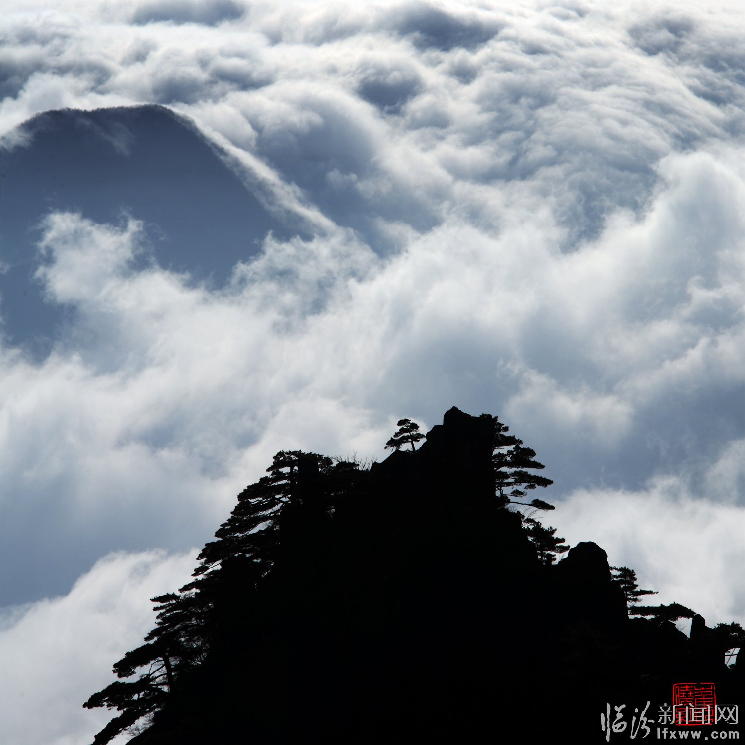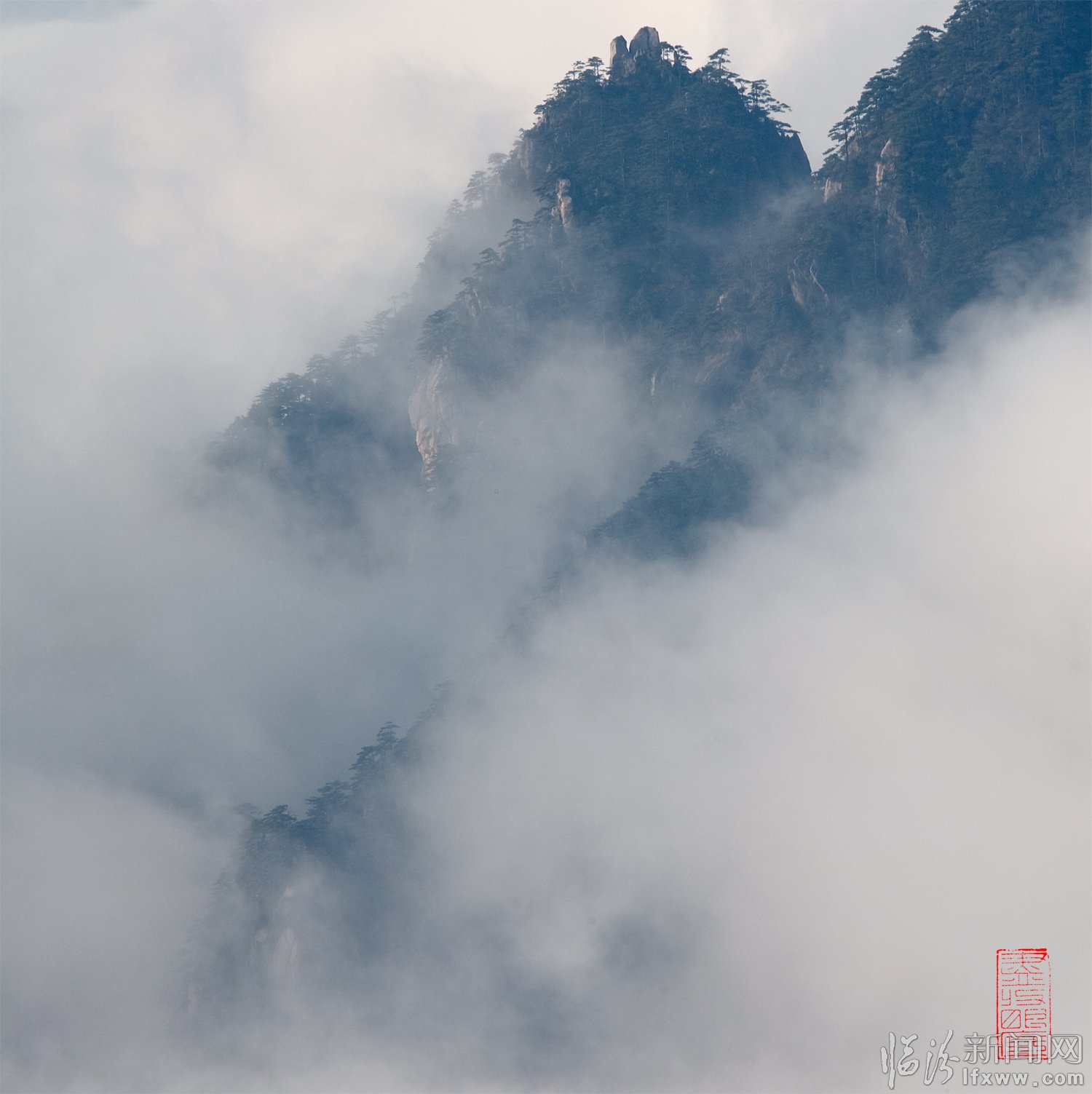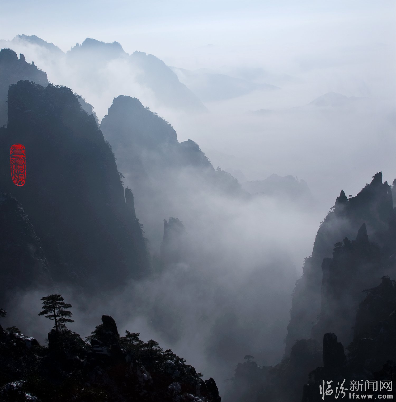 黃山頌(崔曉紅) 奇松怪石云海飛,日出月升彩霞紅。 天賜瑞雪扮山神,我借美景頌天公。