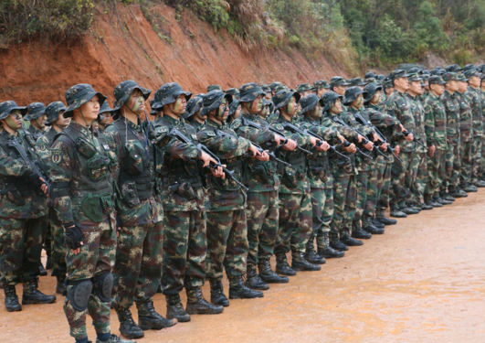 在獵人訓(xùn)練場,特戰(zhàn)訓(xùn)練隊(duì)在滂沱大雨中進(jìn)行訓(xùn)練。手槍步槍槍支分解結(jié)合、精確射擊、多姿射擊、班組射擊;匍匐穿越地樁網(wǎng),潛水通過水下涵洞、翻越輪胎墻、跳火圈、翻大輪胎,訓(xùn)練場上一時爆炸聲四起,硝煙彌漫,“火箭軍,必勝!火箭軍,必勝!”的吼聲回蕩在山頂。