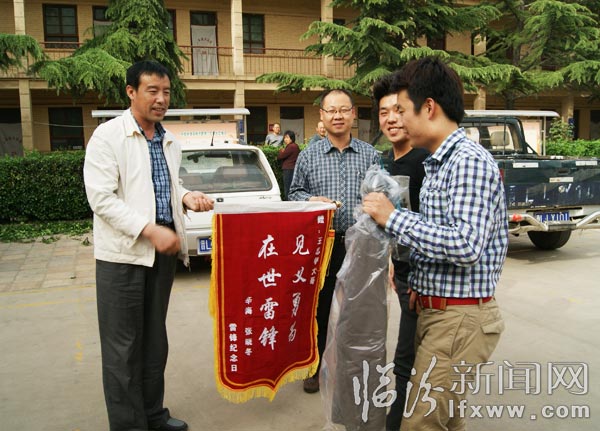 臨汾新聞網訊(記者 邱睿 付基恒) 4月28日下午,在臨汾經商的黑龍江小伙辛海和張曉冬輾轉來到臨汾市一平垣鄉政府大院,向一平垣鄉企業辦主任王志明莊重呈上一面繡有“見義勇為,在世雷鋒”的錦旗,并再三對王志明同志的救助之恩表示感謝。