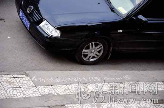圖為面對地面上寫有“晉LHH0XX,請到北城女子中隊處理”的違規停車告知單,一輛牌照為晉L352XX汽車,視而不見地停在了旁邊。