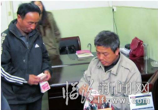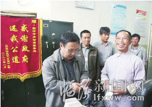 圖為26名河南籍農民工終于領到了苦等兩年之久的工資。 本報記者 白潔 攝