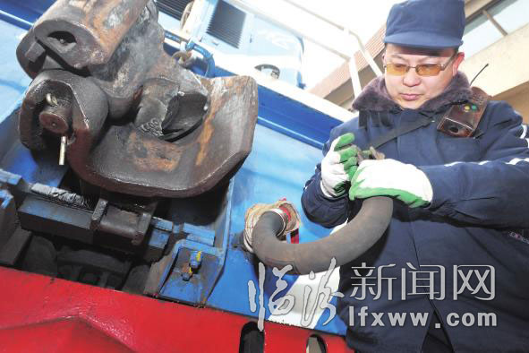 臨汾火車站火車連接員龐大敦在檢查機車風(fēng)管皮圈。36歲的他,13年的春節(jié)都在崗位上度過,每天調(diào)動火車300多輛。他對家人說:我一個人不回家是為了千千萬萬的旅客安全回家,老婆您辛苦啦!”
