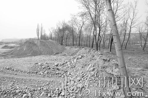 “父親將承包耕地種了樹,老人去世后,我有一技之長,長年在外打工,心想灘地種著樹,讓樹自己慢慢長吧!春節前回家過年,正月初六到地里看到裝載機正挖水渠,原來地里的幾十棵樹不見蹤影,地變成了坑,一邊堆著河卵石,一邊堆著待加工的原料沙,整齊排列在地埂上的樹根裸露在外,有十幾棵不見了。”村民指著現場說,他制止采沙者不得繼續開采,要求采沙者將河道恢復原貌。采沙者只是推了點砂石,墊到快要倒的樹根下,還拉了些黃土墊了一小塊坑。
